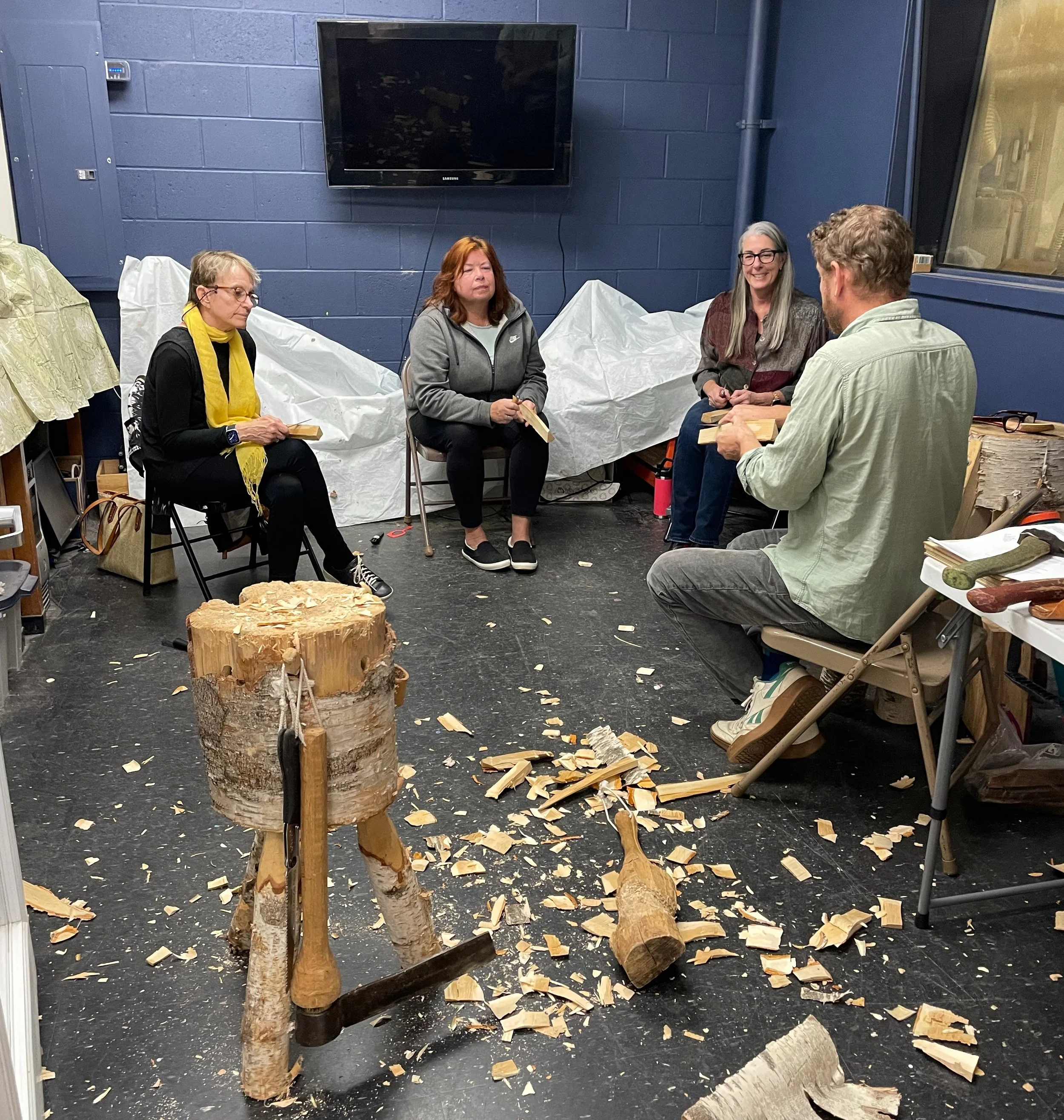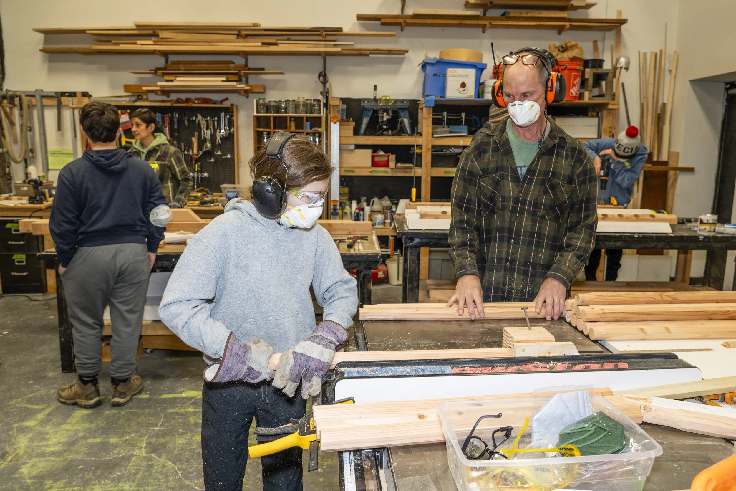 Our woodworking shop is a large room with high ceilings, a ventilation system and garage style door. It includes 3 work tables and a variety of tools including; air compressor, mitre saw, hand tools, jointer, SawShop table saw, drill press, planer, and sanders.